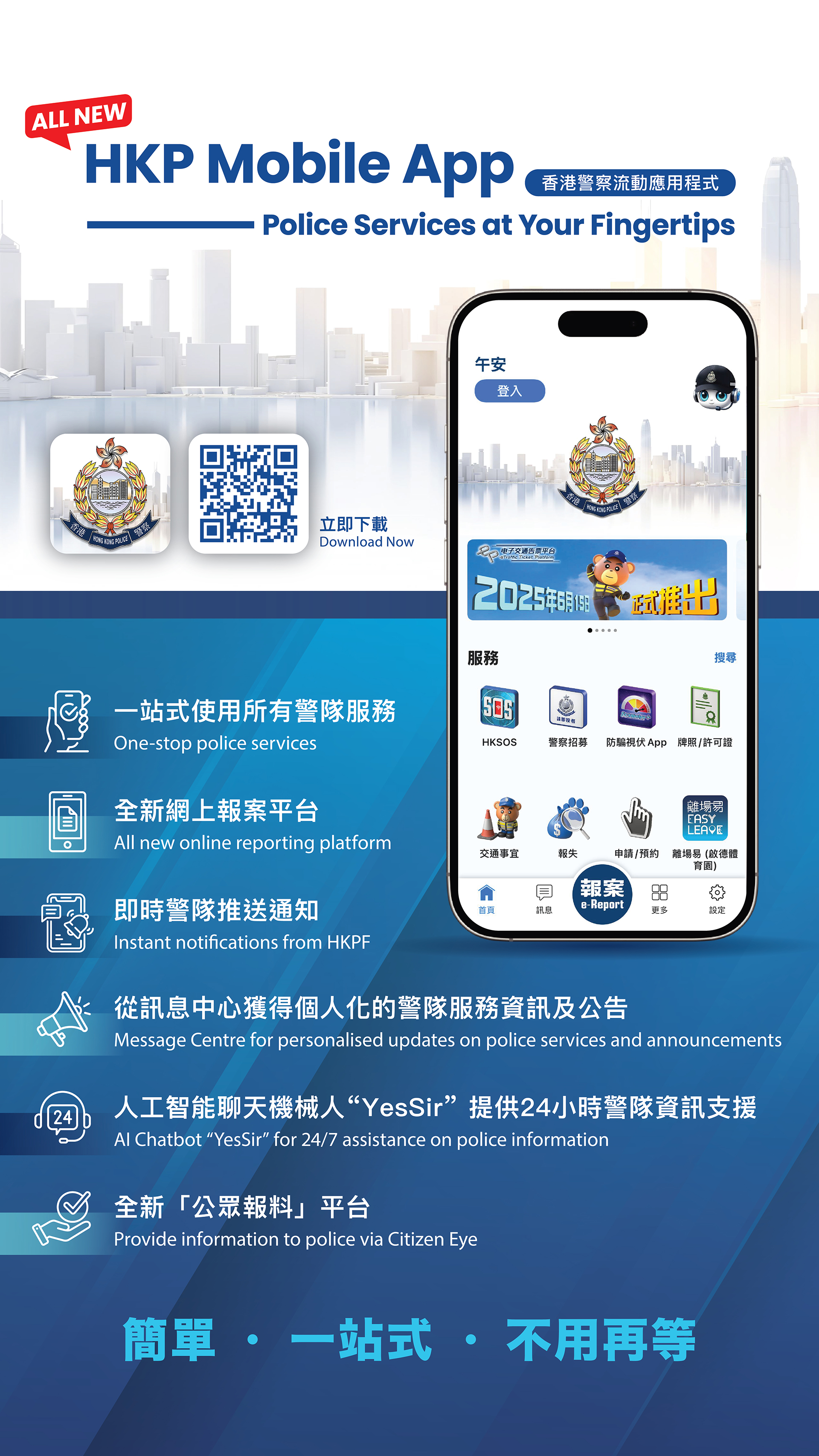 In August 2025, HKPF launched its mobile “Super App”, a one-stop platform integrating over 50 e-services, including reporting lost items and animals, providing crime information, and lodging traffic complaints, and featuring AI chatbot “Yes Sir”. The app also connects to other HKPF apps and platforms, including the HKPF Online Applications Platform, “HKP e-Licence” the outdoor safety tool “HKSOS” and the fraud search engine “Scameter”. This innovation provides high-quality public services and significantly facilitated citizens and business by streamlining and expediting police services and licence/permit application processes for the public.