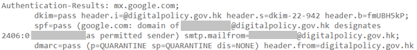 以上的资讯标示该电邮是以「digitalpolicy.gov.hk」的域名密钥进行数码签署,并通过了DKIM的验证。