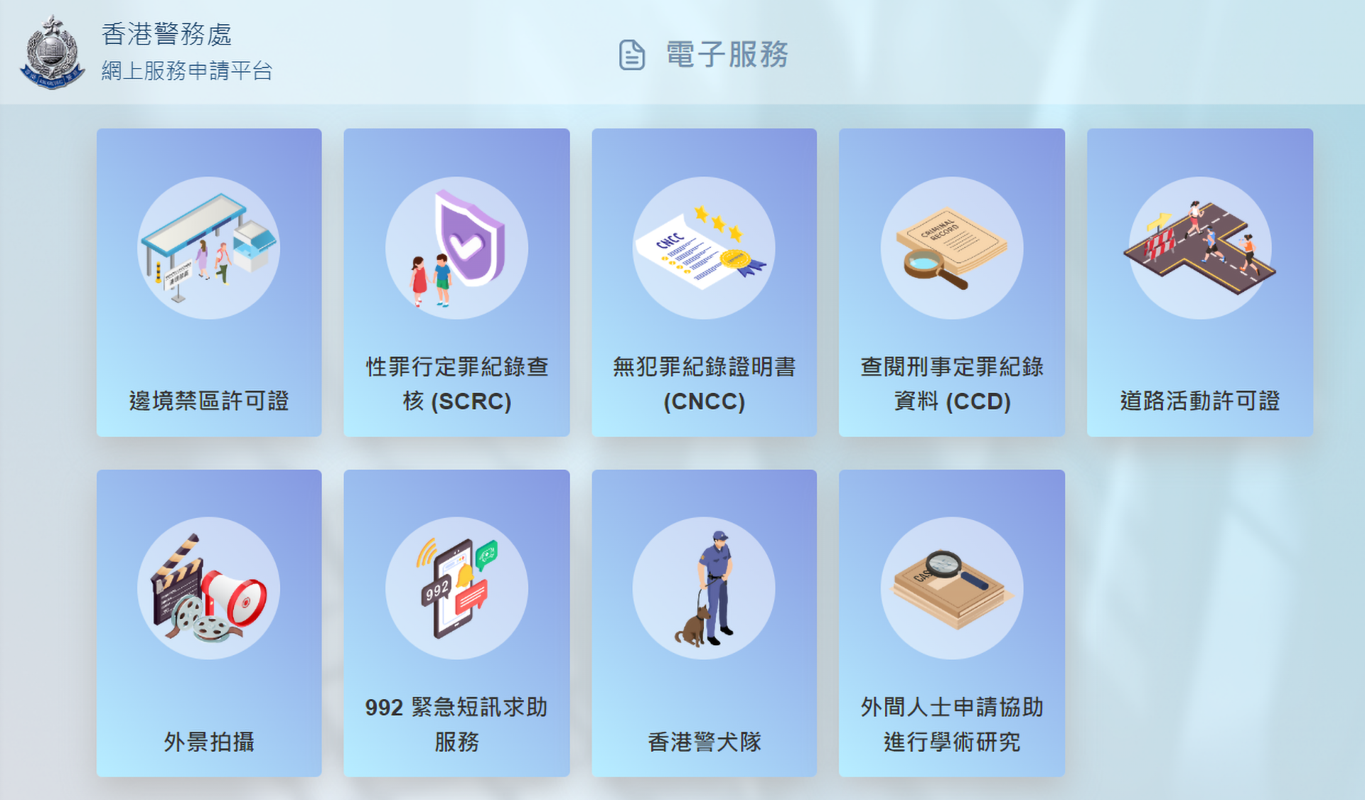 「香港警務處網上服務申請平台」與「香港警察」流動應用程式相輔相成,讓市民可以集中申請警務服務。用戶可在平台申請多達十種許可證及服務,例如禁區通行證和道路活動許可證。透過一站式平台,市民可以全程以電子方式完成申請手續,由使用已儲存的個人資料預填表格提交申請,以至即時網上付款和隨時隨地查詢申請進度及領取電子許可證。